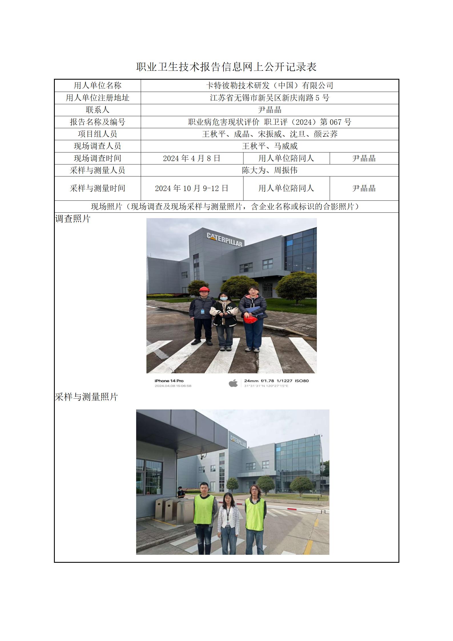 【职业病危害现状评价报告】卡特彼勒技术研发(中国)有限公司