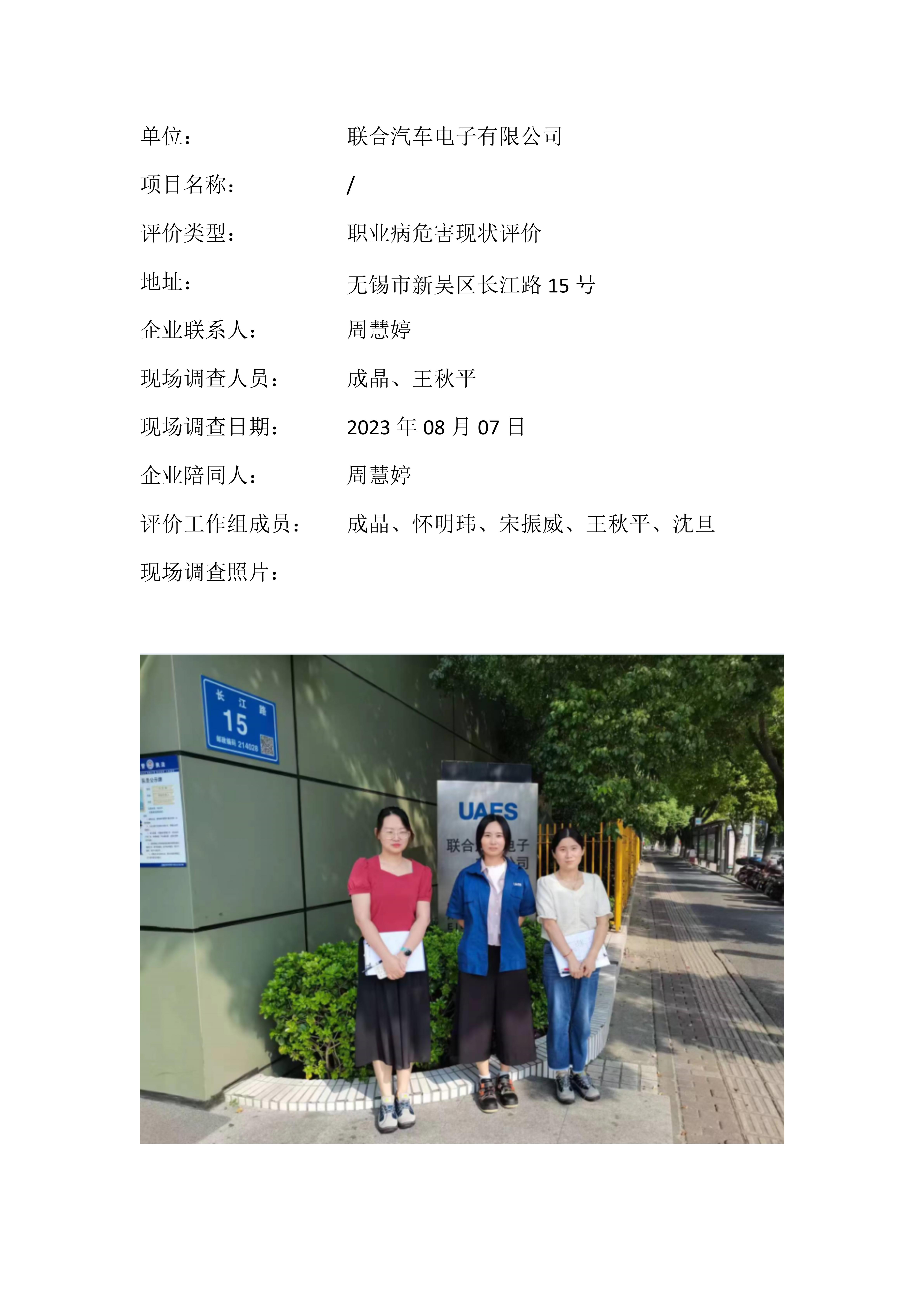 【职业病危害现状评价报告】联合汽车电子有限公司