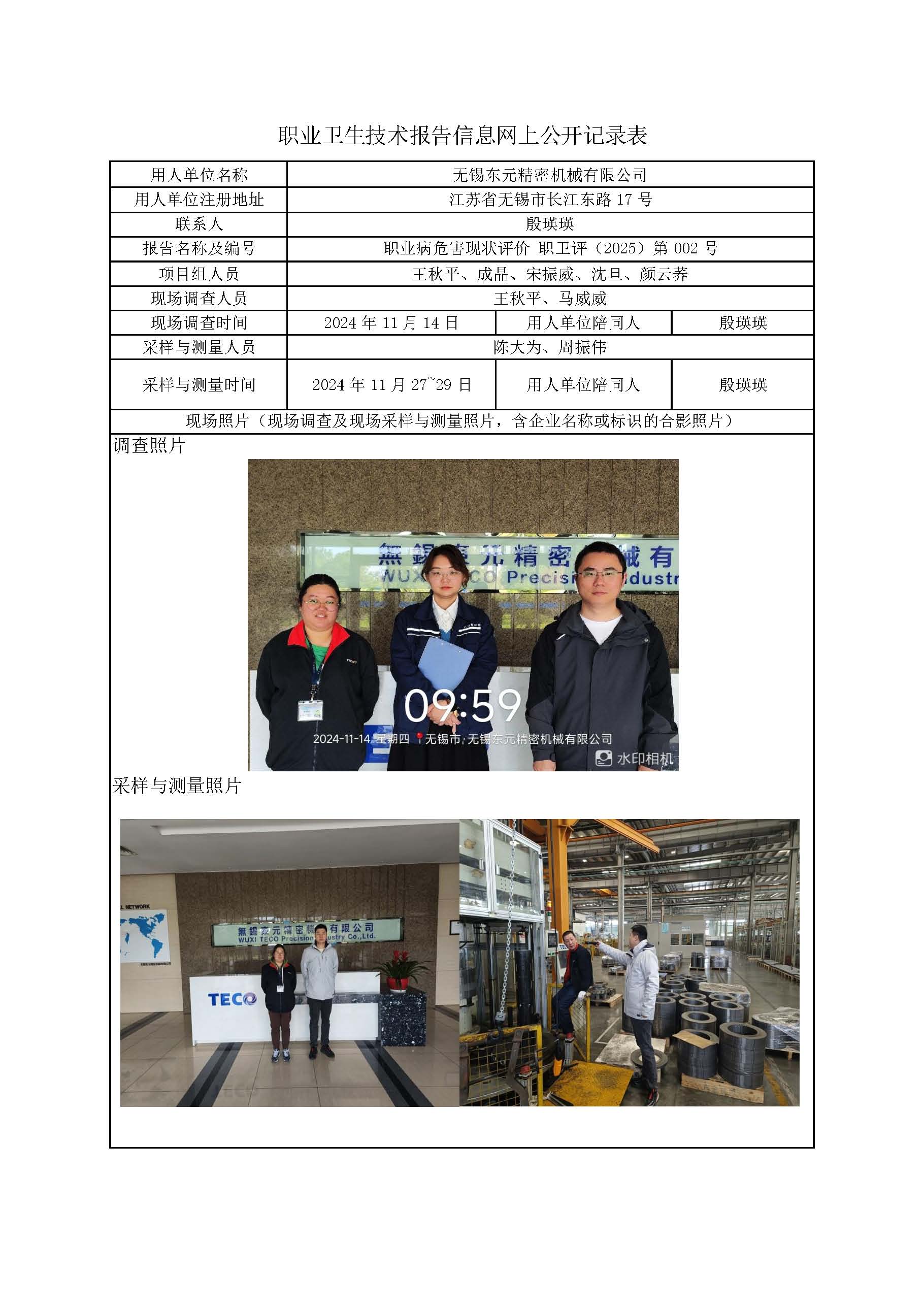 【职业病危害现状评价报告】无锡东元精密机械有限公司