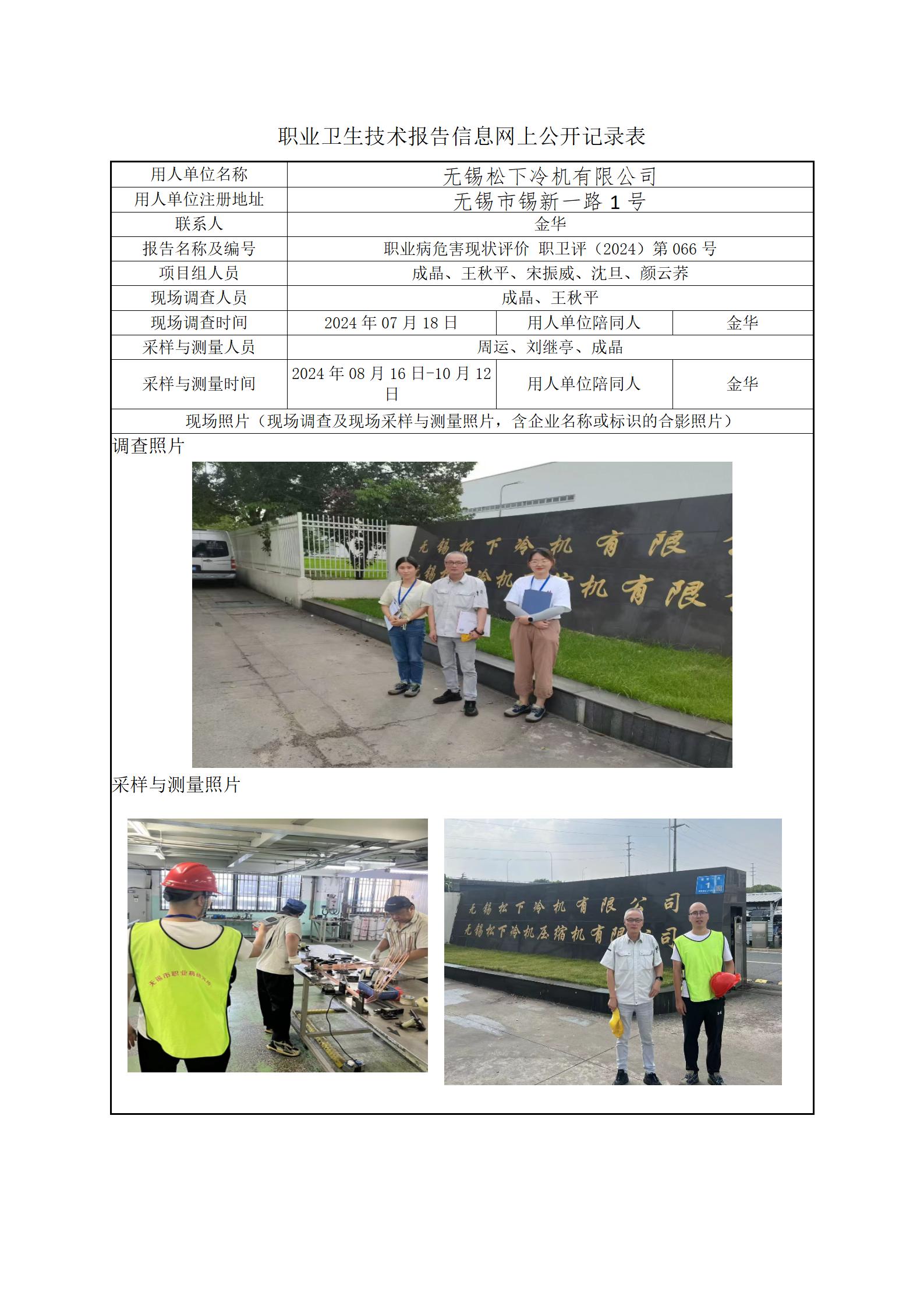 【职业病危害现状评价报告】无锡松下冷机有限公司