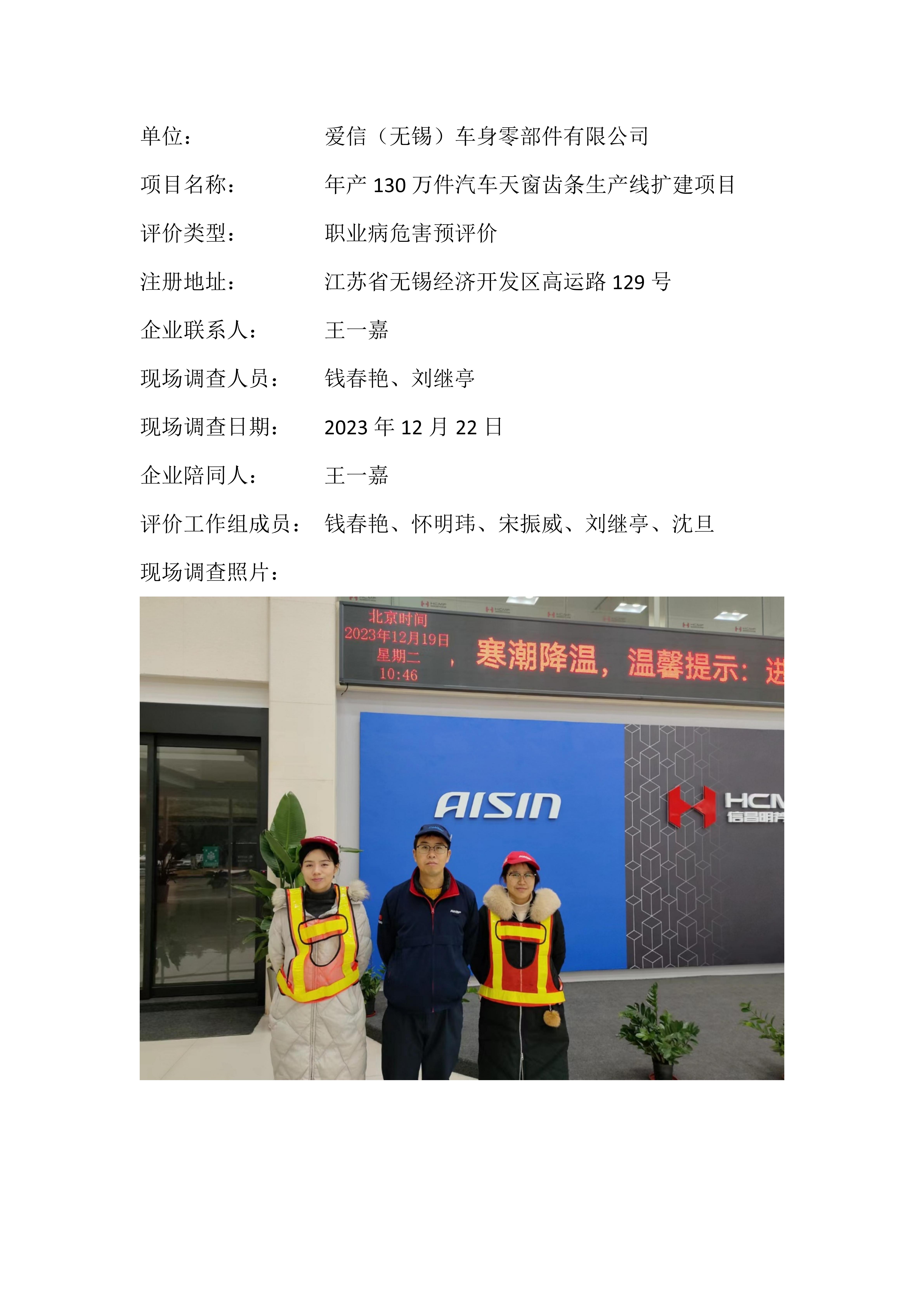 【职业病危害预评价报告】爱信(无锡)车身零部件有限公司年产130万件汽车天窗齿条生产线扩建项目