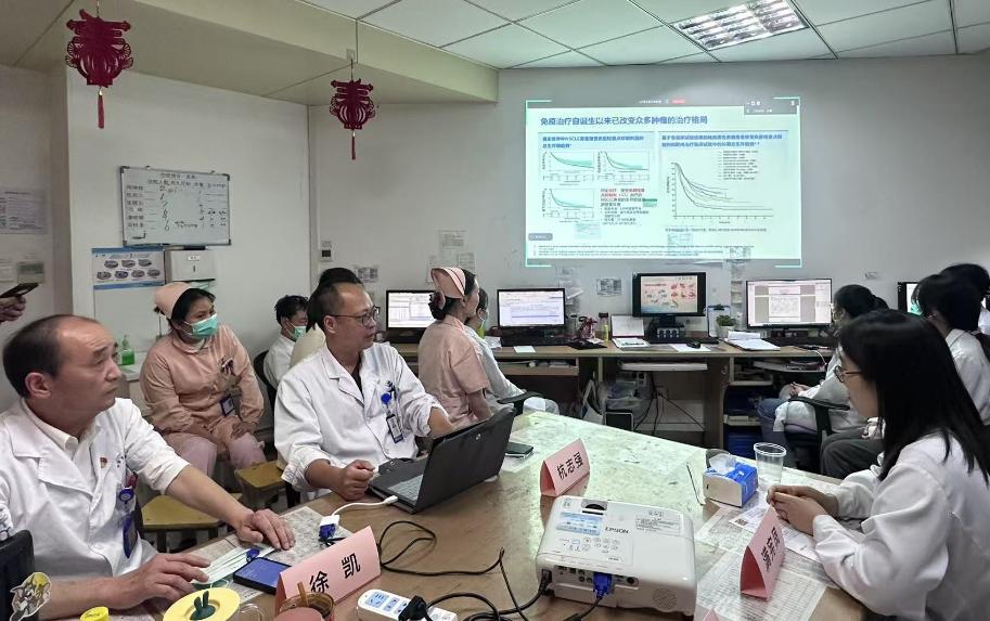 查房结束后,双方医护团队在会议室开展病例讨论。杭主任分享了一例结肠癌伴肝转移患者的综合治疗案例,从化疗方案选择、靶向治疗进展到安宁疗护阶段的症状控制,系统梳理了诊疗关键点。参会人员围绕“如何平衡抗肿瘤治疗与生活质量”展开热议,慈善安宁疗护病房护士长周敏俊表示:“病例分享拓宽了我们的护理视角,尤其在终末期患者心理支持方面获益良多。?