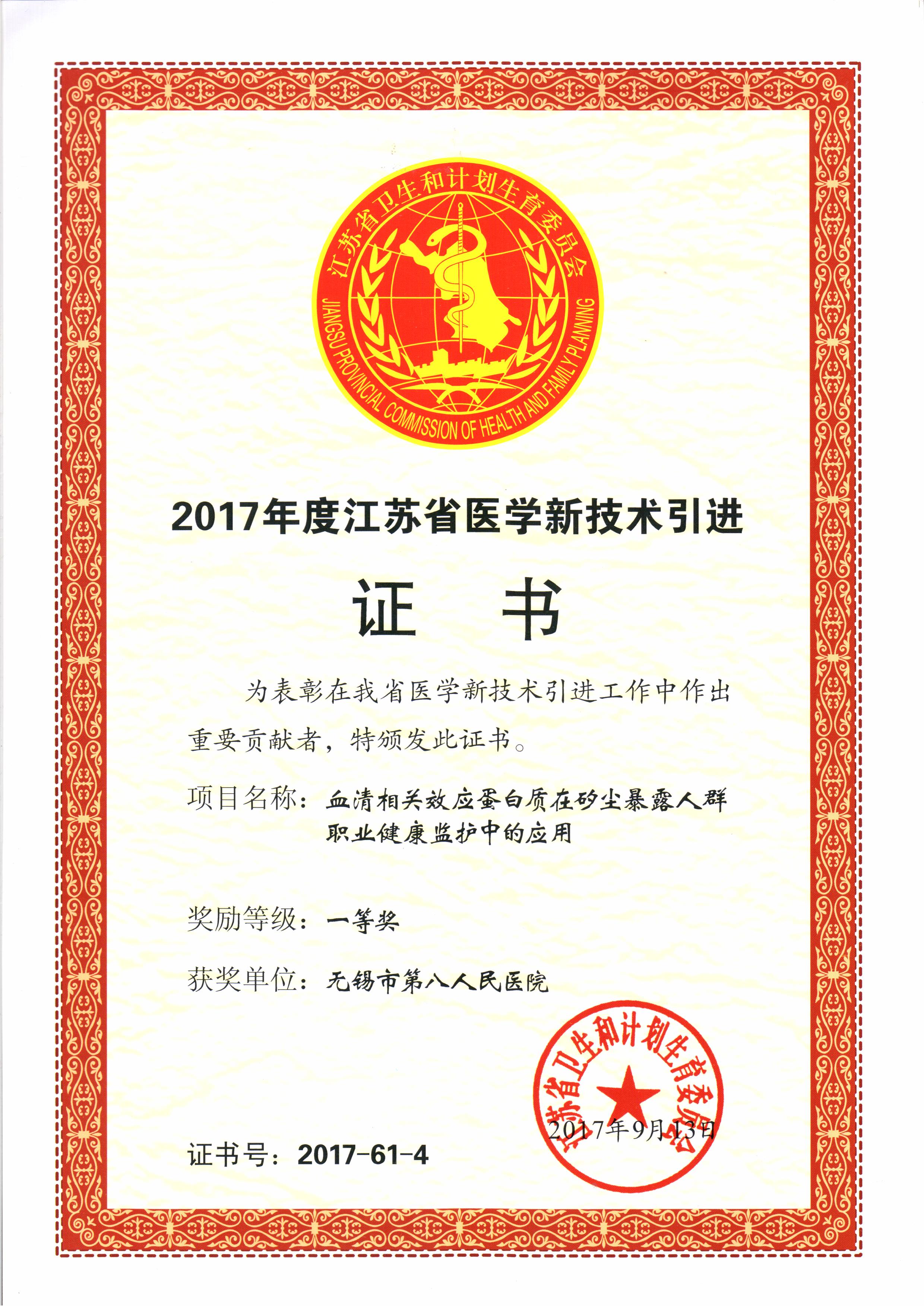 2017年度江苏省医学新技术引进一等奖
