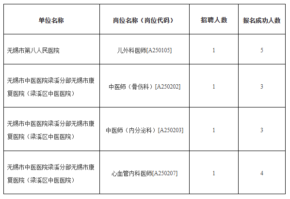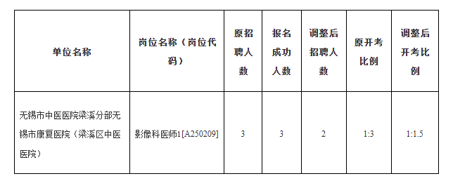 3、根据《2025年无锡市梁溪区卫生健康委下属医疗卫生事业单位公开招聘工作人员公告(普通类)》,下列岗位因报名成功人数未达到开考比例,经市公开招聘综合管理部门核准,予以调整开考比例: